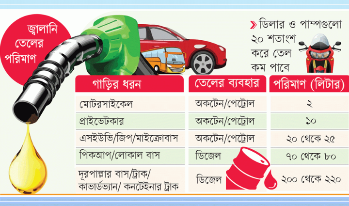 সিদ্ধান্ত মোতাবেক প্রতিটি বাইক ২ লিটার, প্রাইভেটকার ১০ লিটার, জিপ/মাইক্রোবাস ২০-২৫ লিটার, পিকাপ/লোকাল বাস (ডিজেল) ৭০-৮০ লিটার ও দূরপাল্লার ট্রাক/বাস (ডিজেল) সর্বোচ্চ ২০০ থেকে ২২০ লিটার তেল কিনতে পারবে।