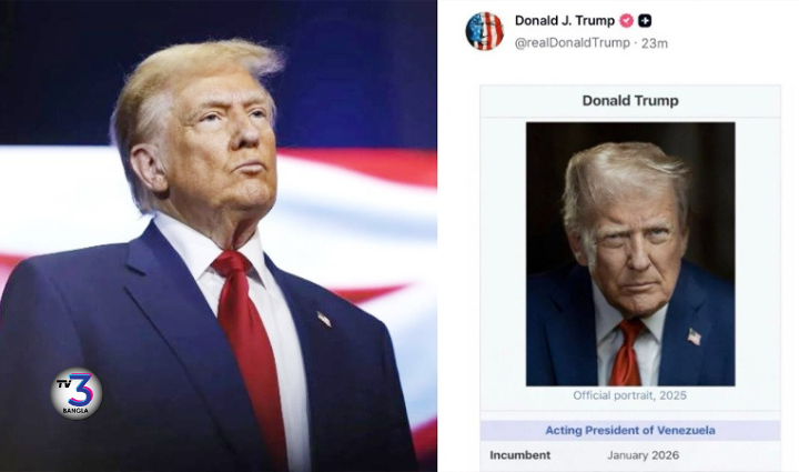 যুক্তরাষ্ট্রের প্রেসিডেন্ট ডোনাল্ড ট্রাম্প সামাজিক যোগাযোগমাধ্যমে নিজেকে ভেনেজুয়েলার ‘ভারপ্রাপ্ত প্রেসিডেন্ট’ হিসেবে দাবি করা একটি ছবি পোস্ট করেছেন। ভেনেজুয়েলায় সাম্প্রতিক বিভিন্ন নাটকীয় ঘটনার প্রেক্ষিতে ট্রাম্প নিজের ট্রুথ সোশ্যাল অ্যাকাউন্টে এই ডিজিটাল ছবি শেয়ার করেন।