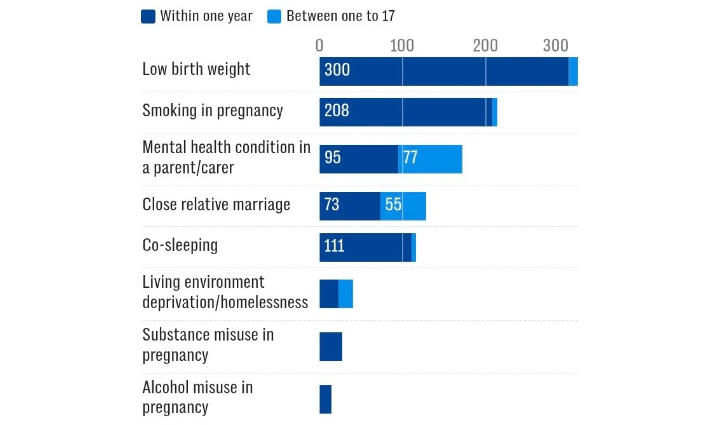 জাতীয় পরিসংখ্যান দপ্তর (ONS) জানায়, নবজাতকের জন্মগত ত্রুটিজনিত মৃত্যুর হার পাকিস্তানি ও বাংলাদেশি মায়েদের মধ্যে ৫৬ শতাংশ, যেখানে শ্বেত ব্রিটিশ মায়েদের মধ্যে তা মাত্র ২৯ শতাংশ।