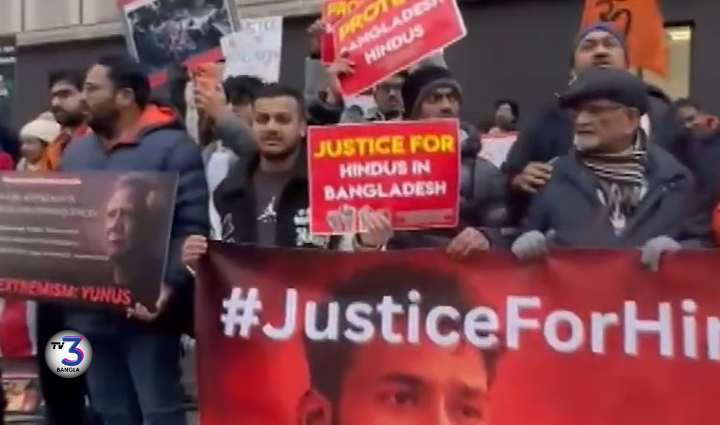 এক পক্ষের বিক্ষোভকারীরা বাংলাদেশে হিন্দু সম্প্রদায়ের ওপর নির্যাতন ও হামলা বন্ধের দাবিতে প্রতিবাদ সমাবেশ করে। তারা অভিযোগ করেন, বাংলাদেশে সংখ্যালঘু হিন্দুরা দীর্ঘদিন ধরে নিরাপত্তাহীনতা, হামলা ও বৈষম্যের শিকার হয়ে আসছে।