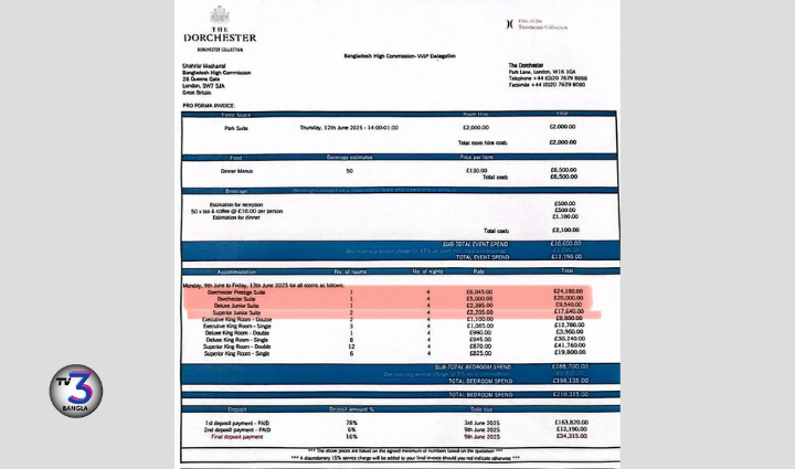 এছাড়া নিরাপত্তা উপদেষ্টার রুম ভাড়া ছিল প্রতিরাতে ৮ লাখ টাকা, চার রাতের জন্য মোট ৩২ লাখ টাকা। সফরসঙ্গীদের জন্য বরাদ্দকৃত স্যুটের ভাড়াও ছিল চোখ ধাঁধানো — ৩.৮১ লাখ, ৩.৫২ লাখ ও ১.৭৬ লাখ টাকা প্রতি রাতে, যার চার রাতের বিল মিলিয়ে দাঁড়ায় ৩৬ লাখ টাকারও বেশি।