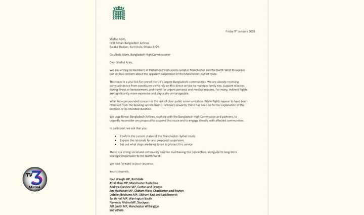 ম্যানচেস্টার–সিলেট সরাসরি ফ্লাইট স্থগিতের সম্ভাব্য সিদ্ধান্ত নিয়ে গভীর উদ্বেগ প্রকাশ করে বিমান বাংলাদেশ এয়ারলাইন্সকে চিঠি দিয়েছেন যুক্তরাজ্যের গ্রেটার ম্যানচেস্টার ও নর্থ ওয়েস্ট অঞ্চলের আটজন সংসদ সদস্য।