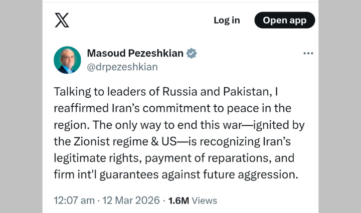 পেজেশকিয়ান লেখেন, ‘রাশিয়া ও পাকিস্তানের নেতাদের সঙ্গে কথা বলে আমি অঞ্চলে শান্তির প্রতি ইরানের প্রতিশ্রুতি পুনর্ব্যক্ত করেছি। এই যুদ্ধ জায়নবাদী শাসনব্যবস্থা ও যুক্তরাষ্ট্র শুরু করেছে। এটি শেষ করার একমাত্র উপায় হলো ইরানের বৈধ অধিকারকে স্বীকৃতি দেওয়া, ক্ষতিপূরণ প্রদান করা এবং ভবিষ্যতে আর কোনো আগ্রাসন না হওয়ার জন্য শক্ত আন্তর্জাতিক নিশ্চয়তা নিশ্চিত করা।’