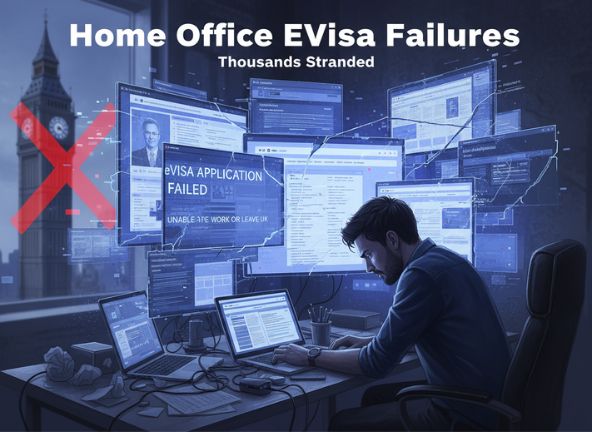 যুক্তরাজ্যে হোম অফিসের ডিজিটালাইজড ইমিগ্রেশন বা অভিবাসন সিস্টেমে (eVisa) সমস্যার কারণে হাজার হাজার বিদেশী নাগরিক কাজে যোগ দিতে পারছেন না এবং দেশ থেকে বের হতে বা প্রবেশ করতে গিয়ে দুর্ভোগের শিকার হচ্ছেন।